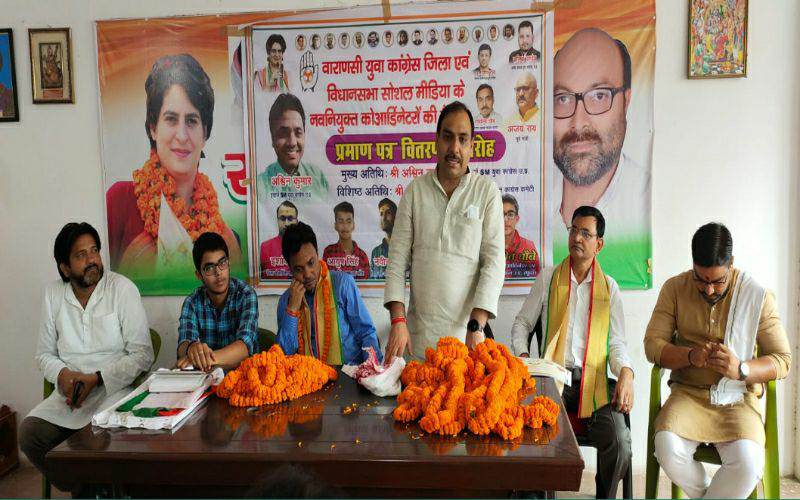 वाराणसी। वाराणसी में युवा कांग्रेस के नवनियुक्त जिला एवं विधानसभा सोशल मीडिया के कोऑर्डिनेटरों की ट्रेनिंग कैंप के तहत बैठक में प्रमाण पत्र वितरण समारोह नेशनल इंचार्ज वैभव वालिया, नेशनल कन्वेनर सुमित दुबे और प्रदेश अध्यक्ष कनिष्क पांडे के निर्देश पर मैदागिन पार्टी कार्यालय पर सम्पन हुई। कार्यक्रम में मुख्य अतिथि के तौर पर उत्तरप्रदेश युवा कांग्रेस सोशल मीडिया के इंचार्ज अश्विन कुमार और विशिष्ट अतिथि महानगर कांग्रेस कमेटी के अध्यक्ष राघवेंद्र चौबे थे। सभी नवनियुक्त पदाधिकारियों को माला और प्रमाण पत्र देकर सम्मानित किया गया।