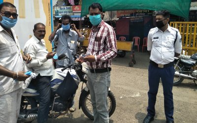 हरदा। कार्यालय कलेक्टर एवं जिला दंडाधिकारी जिला हरदा के आदेशानुसार कोविड 19 के तहत कोरोना संक्रमण नियंत्रण के सघन भ्रमण दल द्वारा नगर में भ्रमण कर बिना मास्क पहने 22 लोगों पर चालानी कार्यवाही 2200/- रुपए की वसूली की की गई।
