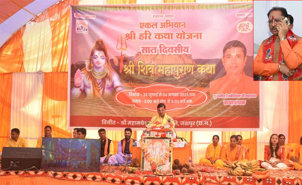 मुख्यमंत्री विष्णु देव साय ने पवित्र श्रावण मास के चौथे सोमवार के शुभ अवसर पर रायपुर स्थित मुख्यमंत्री निवास कार्यालय से जशपुर जिले के कुनकुरी विकासखंड अंतर्गत मयाली में विश्व के सबसे बड़े प्राकृतिक शिवलिंग मधेश्वर पहाड़ के समीप आयोजित दिव्य शिव महापुराण कथा के समापन समारोह को ऑनलाइन माध्यम से संबोधित किया।