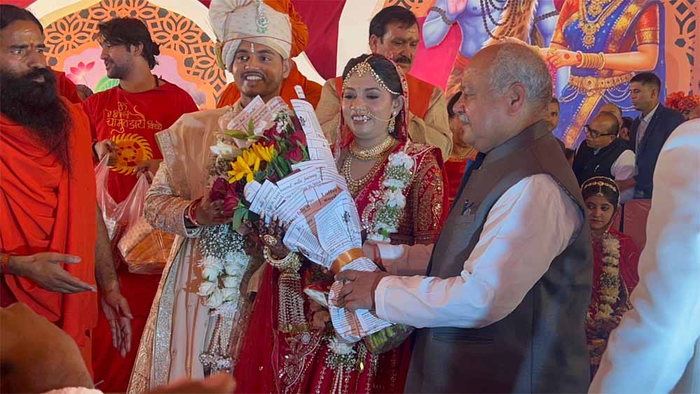 धीरेंद्र कृष्ण शास्त्री और बाबा रामदेव ने दिया दूल्हा-दुल्हन को आशीर्वाद