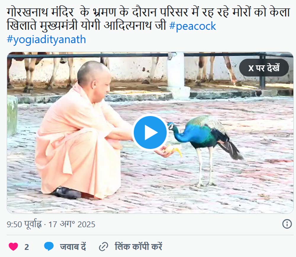 गोरखनाथ मंदिर के दौरे पर मुख्यमंत्री योगी आदित्यनाथ ने मंदिर परिसर में रह रहे मोरों को केला खिलाया. इस दौरान का वीडियो भी सामने आया है, जिसमें मुख्यमंत्री को बड़े स्नेह से मोरों को फल खिलाते देखा जा सकता है. यह दृश्य लोगों को खूब पसंद आ रहा है.