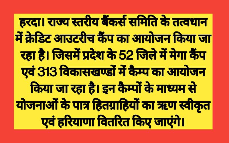 हरदा। राज्य स्तरीय बैंकर्स समिति के तत्वधान में क्रेडिट आउटरीच कैंप का आयोजन किया जा रहा है। जिसमें प्रदेश के 52 जिले में मेगा कैंप एवं 313 विकासखण्डों में कैम्प का आयोजन किया जा रहा है। इन कैम्पों के माध्यम से योजनाओं के पात्र हितग्राहियों का ऋण स्वीकृत एवं हरियाणा वितरित किए जाएंगे। जिला प्रबंधक अग्रणी बैंक श्री गिरीश तिवारी ने बताया कि क्रेडिट आउटरीच कैंप के आयोजन के लिए 13 अक्टूबर को एलडीएम ऑफिस में बैंकर्स की अनिवार्य बैठक सम्पन्न हुई। जिसमें जिला मुख्यालय एवं विकास मुख्यालय में डीएफएसएसएसबीसी निर्देशित मेगा क्रेडिट केम्प लगाने के विषय में चर्चा हुई। इसी संदर्भ में जिला उद्योग कार्यालय में महाप्रबंधक एवं अन्य स्वरोजगार मूलक विभाग के प्रमुख के साथ भी बैठक की गई। जिसमें केम्प की तिथियों एवं आपसी सहयोग, सामन्जस्य पर विचार किया गया। बैठक में मुख्यालय पर एवं विकासखंड पर तिथियों का निर्धारण किया गया। जिला मुख्यालय एवं विकासखण्ड स्तर के कैंपों के आयोजन के लिए जिला समन्वयक को उनकी शाखा की संख्या के आधार पर सबंधित बैंक को दायित्व सौंपे गये। उन्होंने बताया कि हरदा मुख्यालय पर आयोजित कैंप के लिए प्रबंधक जिला अग्रणी बैंक को दायित्व सौंपे गए हैं। इसी प्रकार हरदा विकासखंड के लिए सीबीआई बैंक के श्री अरुण दास एवं एसबीआई की श्रीमती अनामिका को दायित्व सौंपा गया है। टिमरनी विकासखंड के लिए एमपीजीबी की श्रीमती आरती अग्रवाल तथा खिरकिया विकासखंड के लिए बीओआई के श्री हरीश मेहरा को दायित्व सौंपे गए हैं। एलडीएम श्री तिवारी ने बताया कि विकासखंड स्तर पर एवं जिला स्तर पर खिरकिया विकासखंड मुख्यालय में 29 अक्टूबर को, हरदा विकासखंड मुख्यालय में 2 नवम्बर को, टिमरनी विकासखंड मुख्यालय में 10 नवम्बर को एवं जिला मुख्यालय हरदा में 15 नवम्बर को क्रेडिट आउटरीच कैंप का आयोजन किया जाएगा।
