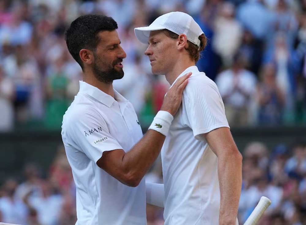 23 साल के जैन‍िक सिनर ने 38 साल के नोवाक जोकोविच को 6-3, 6-3, 6-4 से हराकर पहली बार व‍िम्बलडन फाइनल में जगह बना ली. दोनों के बीच यह मुकाबला महज 1 घंटे 55 मिनट तक चला. सिनर ने मैच में 36 शानदार शॉट (विनर्स) लगाए, 12 ऐस मारे और सिर्फ 2 डबल फॉल्ट किए. सर्व करते हुए उन्होंने पहली सर्व पर 81% और दूसरी सर्व पर 63% अंक जीते.