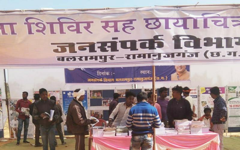 छत्तीसगढ़ में बलरामपुर जनसम्पर्क विभाग द्वारा विकासखण्ड स्तर पर चिन्हांकिंत हाट बाजारों में कलेक्टर श्री कुन्दन कुमार के निर्देशन में सूचना शिविर सह छायाचित्र प्रदर्शनी का आयोजन किया जा रहा है। शासन की महत्वाकांक्षी और जनहितैशी योजनाओं की दी जा रही है जानकारी। शिविर में ग्रामीणों को स्वास्थ्य परीक्षण कर निःशुल्क वितरण किया जा रहा दवाई।