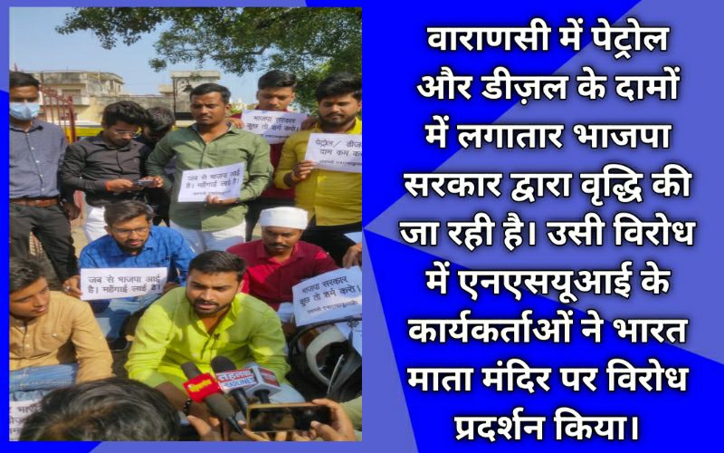 वाराणसी। पेट्रोल और डीज़ल के दामों में लगातार भाजपा सरकार द्वारा वृद्धि की जा रही है। उसी विरोध में एनएसयूआई के कार्यकर्ताओं ने भारत माता मंदिर पर विरोध प्रदर्शन किया।