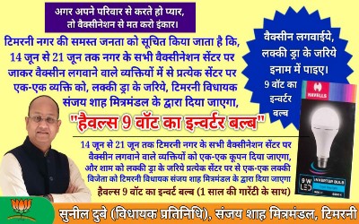 नगर में वैक्सीन लगवाने के लिए अधिक अधिक नागरिक आएं और लोगो में जागरूकता बढ़े। इसलिए विधायक संजय शाह मित्रमंडल द्वारा आकर्षक उपहार योजना दिनांक 14 जून से 21 जून तक चलाई जा रही है। विधायक प्रतिनिधि श्री सुनील दुबे में बताया कि टिमरनी वासियो दिनांक 14 जून से 21 जून तक नगर के सभी वैक्सीनेशन सेंटर पर वैक्सीन लगवाने वाले व्यक्तियों को टिमरनी विधायक संजय शाह मित्रमंडल के द्वारा वैक्सीनेशन सेंटर पर ही कूपन दिया जाएगे और प्रत्येक सेंटर पर जो भी दो लक्की विजेता होंगे। उन्हें संजय शाह मित्रमंडल टिमरनी के द्वारा पुरुस्कृत किया जायेगा। योजना के प्रथम दिवस सोमवार को दो विजेताओं को प्रदान की गई। टीकाकरण दल में शामिल टीकाकर्ता रितु पोटफोडे और नर्मदा मन्डलोई ने ड्रा निकाला और विजेताओं को बधाई दी।