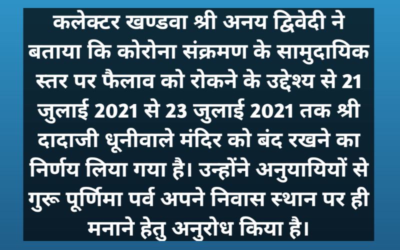 कोरोना संक्रमण के सामुदायिक स्तर पर फैलाव को रोकने के उद्देश्य से जिला प्रशासन खण्डवा द्वारा 21 जुलाई 2021 से 23 जुलाई 2021 तक श्री दादाजी धूनीवाले मंदिर को बंद रखने का निर्णय लिया गया है। उन्होंने अनुयायियों से गुरू पूर्णिमा पर्व अपने निवास स्थान पर ही मनाने हेतु अनुरोध किया है।